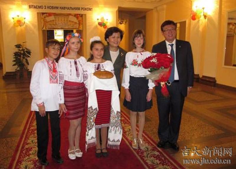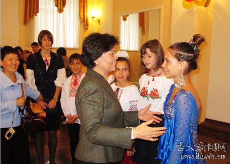 在会谈的同时,来自基大孔院、孔子课堂的当地师生们早已等候在学校大厅。11时左右,当代表团一行来到基大孔院大厅时,可爱的乌克兰小朋友们手捧着美丽的玫瑰花以及象征对尊贵客人最高礼遇的黑面包和盐迎接代表团。随后,小朋友们还为代表团表演了精彩的云南民歌《猜调》、中国民族舞蹈《孔雀舞》等精彩节目。代表团观看后,对乌克兰小朋友学习汉语和中国文化的成果感到高兴,为中乌双方汉语教师付出的努力感到欣慰。许琳接见当地小朋友时,赠予了他们精美的纪念礼物,并鼓励他们好好学习汉语,以后能为中乌友谊桥梁建设做贡献。