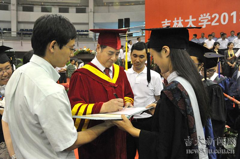 李元元为每位毕业生代表授予学位证书,并一一与之握手、合影,3场学位授予仪式,6件被汗水浸透的白衬衫,3000余次握手、3000余次转身、1000余次拥抱、3次抛洒花束……每一句问候、每一声叮咛、每一个举动都向学子们传递着力量、信念和温暖。无数次热烈而持久的掌声和“校长,我们爱你”的欢呼声传达着吉大学子们对母校、对恩师、对校长的无限眷恋和崇高敬意。
