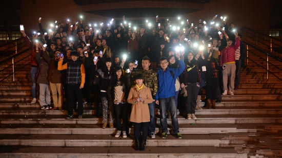 大家在留言板上写下自己的祝福,并用手机屏幕的亮光在台阶上摆起了又一颗爱心。在川渝老乡会会长何苗的带领下,大家高喊“雅安雄起”,希望能给予远方的同胞更多的力量。