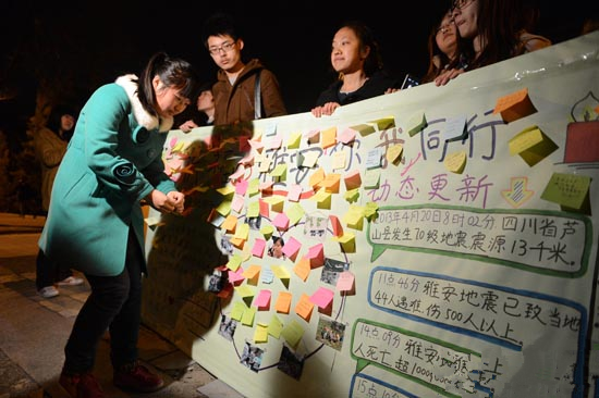 来自新民校区的一名大三学生这样鼓励自己:“我想用我的阳光带给更多人温暖,我牵挂着家的那边,所以我也会哭泣,也会担心,但是我会去提高自己,这才是不辜负家乡的期待。” 不用道德感绑架爱心,每个人力所能及地做好该做的事,这也是为雅安祈福的一种方式。(陈佳丽)