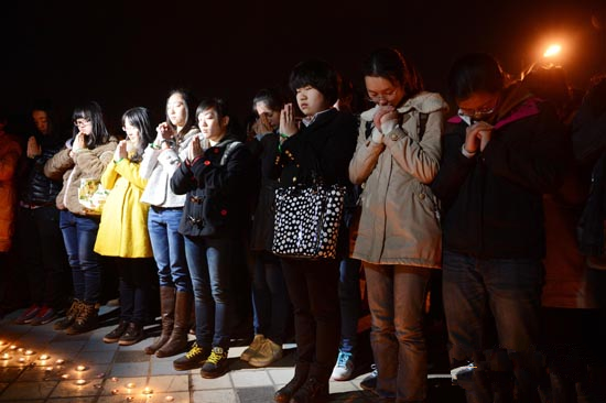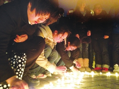 晚7时,200余名吉大学子手捧蜡烛聚集在中心校区体育馆北门,围在蜡烛拼成的心形图案前,一起为雅安祈福。一些学校老师、周边家属区的朋友也慕名前来,传递温暖。活动进行了“手系祈福绿丝带”“受灾学生代表发言”“双手合十祈福30秒”“写祝福便签”等环节。