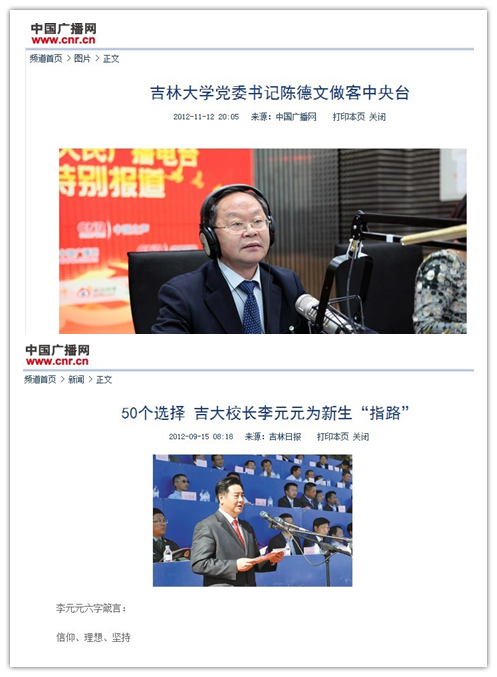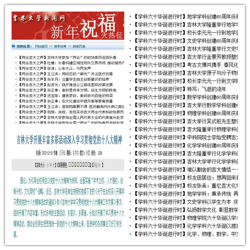 一年来,人民日报、新华社、中国青年报、中国教育网以及吉林省多家媒体对百富策略白菜网的关注热度丝毫不减,仅吉大新闻网•媒体吉大栏目刊载的校外媒体报道吉大的新闻事件就有170余件,单条点击达6000次。这其中,多数新闻都是经由新闻网记者深度挖掘、及时采写发布后引起了校外媒体的广泛关注。吉大新闻网策划、采编发布的“基层组织建设年”“身边的感动”“学科六十华诞进行时”“关注党的十八大”“就业季”等10余个专题报道紧紧围绕学校中心工作和教育热点,旨在全校范围内树立健康向上的价值观念,从而引领高校舆论潮流。