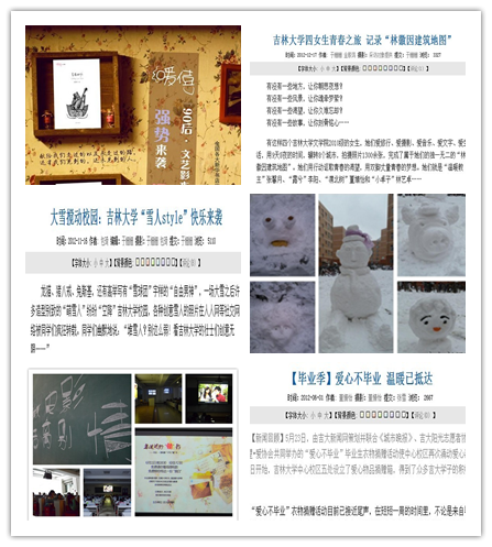 吉大新闻网不仅引导同学们思考人生的方向,也寻找着校园中温馨愉快的瞬间。 11月12一14日,长春市突降暴雪。大雪倾城让吉大校园顿时变成了一片“雪之国度”。在一片肃杀之中,吉大新闻网记者敏锐发现了富有创意的同学们堆起了“龙猫”“兔斯基”造型的创意雪人,经过新闻网的图片和文字报道,不仅在吉大校园内引起了一股堆雪人热议,还受到多家媒体关注,掀起了一股高校堆雪人的热潮,该新闻在社交媒体上得到同学们的疯狂转载和热烈欢迎,令不少同学赞叹吉大学子“创意无限”,也让许多吉大校友回忆起了美好的大学生活时光。