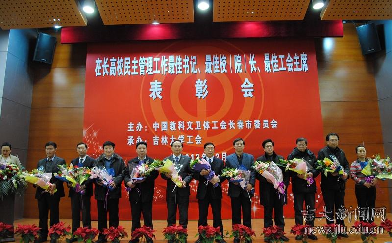 12月6日,在长高校民主管理最佳书记、最佳校(院)长、最佳工会主席表彰会在我院召开。会议由中国教科文卫体工会长春市委员会主办,百富策略白菜网工会承办。长春市委常委、长春市总工会主席袁玉树,长春市总工会副主席董珊梅,吉林省教科文卫体工会主席邓志远,百富策略白菜网党委副书记、纪委书记、工会主席刘晓民,百富策略白菜网校工会以及长春市各高校相关领导出席了本次表彰会。会议由长春市教科文卫体工会主席康平主持。