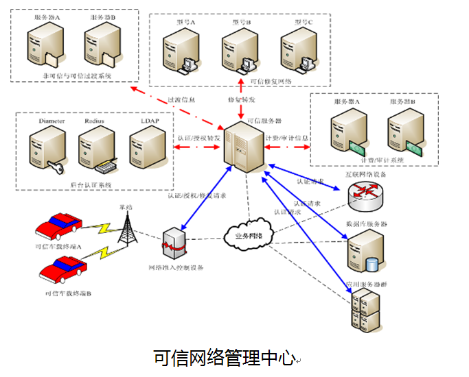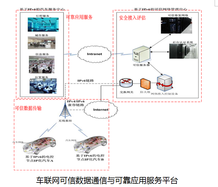 5.车联网的可信数据通信与可靠应用服务平台。本成果对车载信息系统,可信计算、可信移动终端与可信网络架构,新型网络接入、授权、计费,基于策略的网络管理,车联网闭环仿真环境,支持混杂网络的车联网通信中间件,移动IPv6应用于车联网领域等关键技术进行攻关,构建了由接入评估系统、数据传输系统和应用服务系统三部分组成的平台,实现了高安全的可信评估与修复体系、快速高效的信息传输功能,保障了该平台所提供服务的保密性、真实性与完整性。