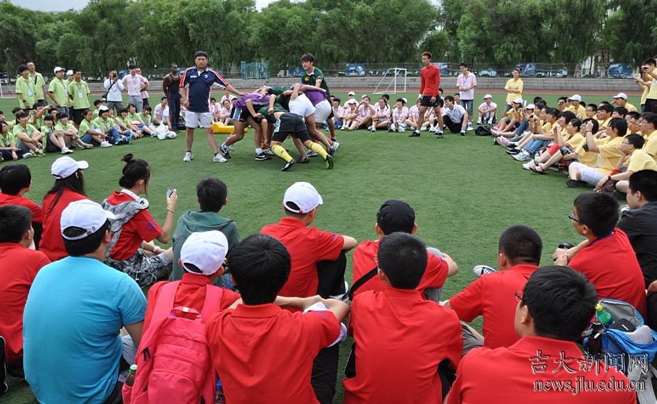 ——观摩英式橄榄球赛营员们围坐在宽阔的绿茵场上,看橄榄球队员们精彩的演示表演 (马龙/摄影)