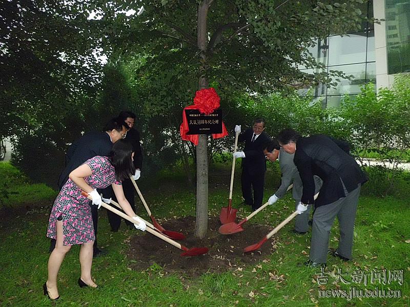 纪念活动结束后,王胜今与井上琢智一同在校园中植下象征两校友谊长存的树苗。