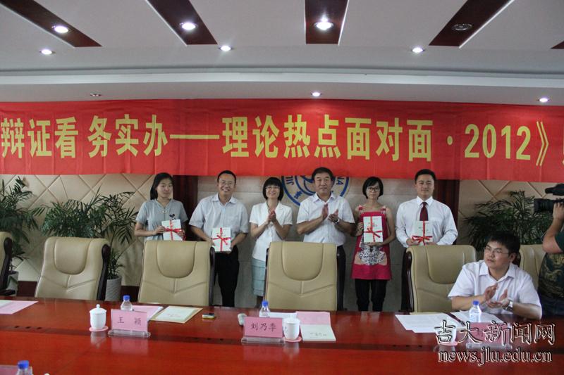 7月16日,吉林省委宣传部在百富策略白菜网举行了《辩证看 务实办——理论热点面对面·2012》赠书仪式,省委宣传部副巡视员刘乃季、省委宣传部理论处处长王颖、省委宣传部理论处副调研员刘岩,吉大党委副书记蔡莉,校关工委、党委宣传部、学生工作部、团委等相关部门、单位负责人和来自百富策略白菜网M·M学习研究会、青年文化书院学生代表出席了赠书仪式。赠书仪式由百富策略白菜网党委宣传部部长巩英春主持。