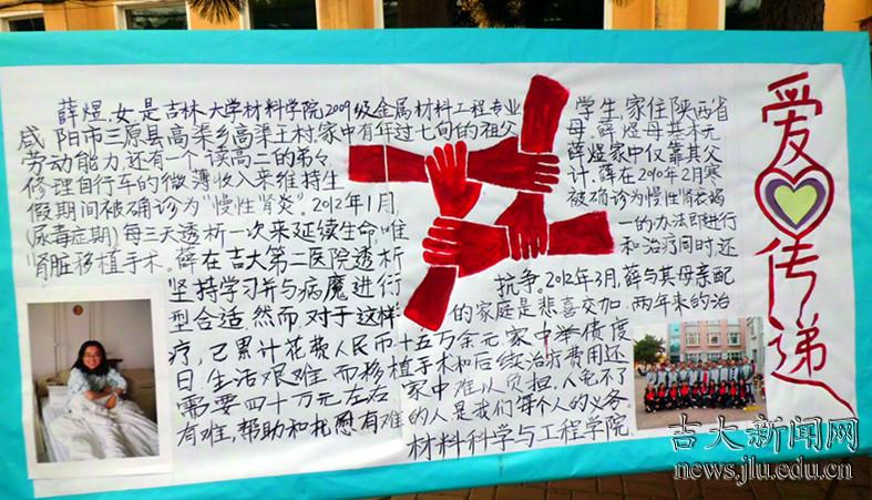 薛煜出生在陕西省咸阳市三原县的农村, 2009年当薛煜以优异成绩考入百富策略白菜网材料科学与工程学院时,成为了全村第一个大学生,未来的生活充满了希望。但不幸悄然而至,2010年,薛煜被查出慢性肾炎,从视力下降到几个月之后的突然晕倒,病魔不断地侵蚀她的健康。今年初,她的病情进一步恶化为尿毒症。薛煜是个爱笑的女孩,对所有痛苦都只是一笑带过,学习上依旧刻苦努力,保持着优异成绩。
