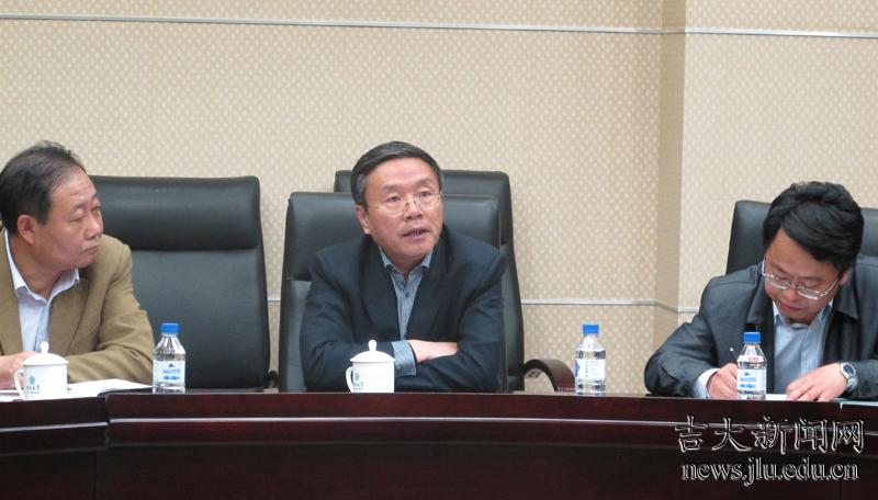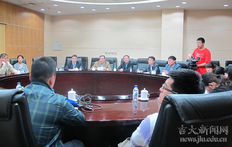 吉大党委副书记兼副校长韩晓峰(中)接受媒体采访