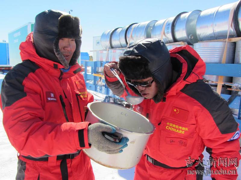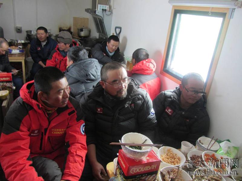 当然,提到内陆生活就必须提到衣食住行医等日常生活中的活生生的章节。前往南极考察,队里为每名队员配备了很保暖的防寒巨人工作服、御寒羽绒服、羽绒内胆、保暖内衣、各种帽子、手套、围巾、面罩、雪地靴及鞋套、墨镜等一系列防护用品及衣物,最大限度地保护了我们在南极工作时免受冻伤的折磨。吃这方面,可以说我们是蛮幸福的,随队大厨是个热心又细心的厨师,我们在前往内陆的路上每天吃他做好的航空餐,到了昆仑站他还给我们做了一些所谓新鲜的菜(除了航空餐)。大厨不仅在路上,中午为我们加热牛奶和面包,还在我们睡前给我们热好牛奶送到舱内,真是无微不至。每当过节或者有队员过生日,他都会多烧几个菜,拿出一盒备好的生日蛋糕,让大家借此机会热闹一番,舒缓一下紧张工作中的压力。我们内陆队从出发后就一直住在雪橇上的成员舱里,狭小的空间里要挤满8个人,舱的功能就是睡觉,但是每到晚上的时候,一个舱的队友还会在一起吃吃水果,聊聊天,排解一下想家的郁闷和工作的无聊,这也是队员们沟通感情的最佳时机。医疗保障同样是不可或缺的,我们的随队医生也是个极富责任心的人,不仅对有高原反应的队员进行细心治疗与照顾,还一路坚持为我们测试血压、心功能、血氧含量等生理指标;不仅对我们的感知、认知能力进行监测,还定期通过调查问卷掌握我们队员的心理状况,有了他的关心我们便可以安心工作了。