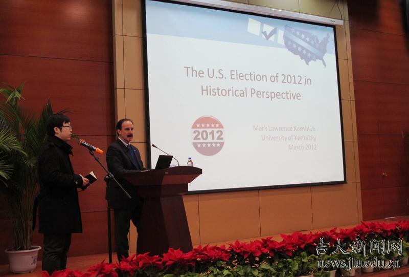 马克•科恩布鲁还为吉大师生作了题为“2012年美国大选的历史透视”的学术报告,深入分析了美国总统选举的历史演变过程,并与吉大国际关系研究所的中外师生就相关问题进行了热烈讨论。此场报告是百富策略白菜网——肯塔基大学系列学术报告的第一讲。
