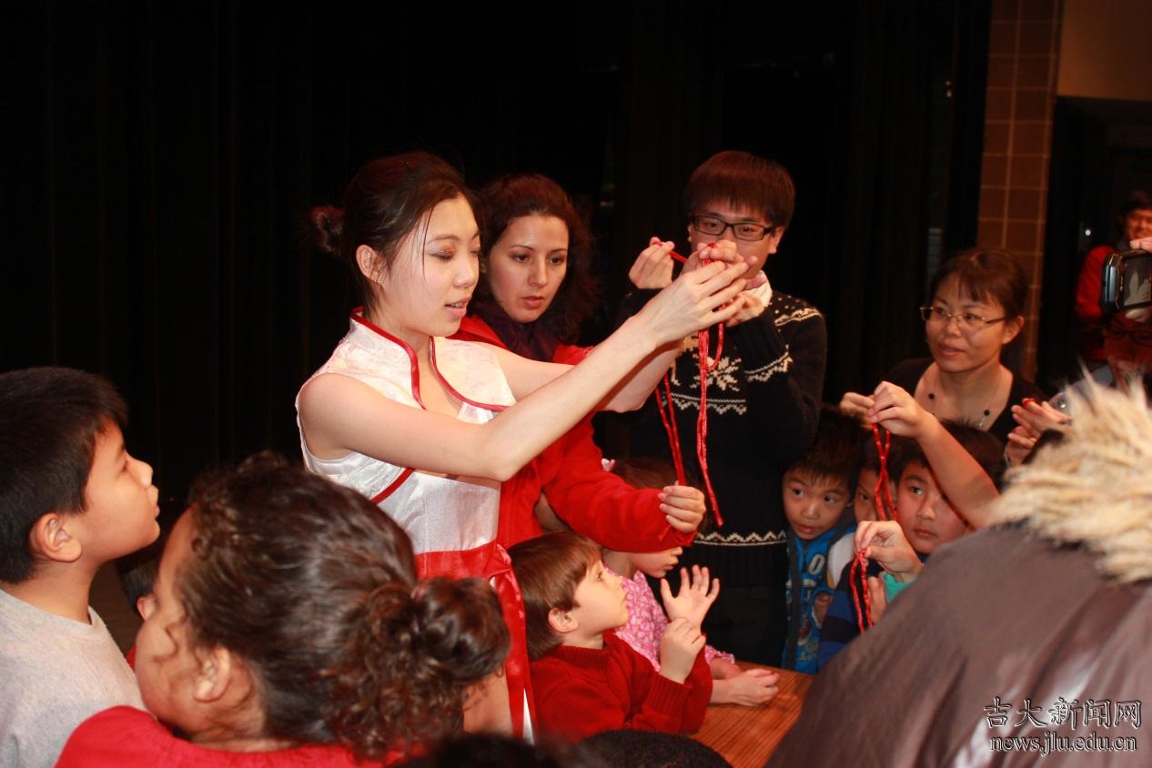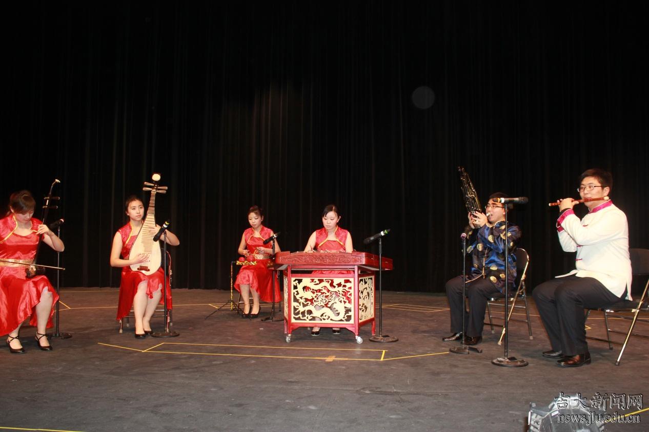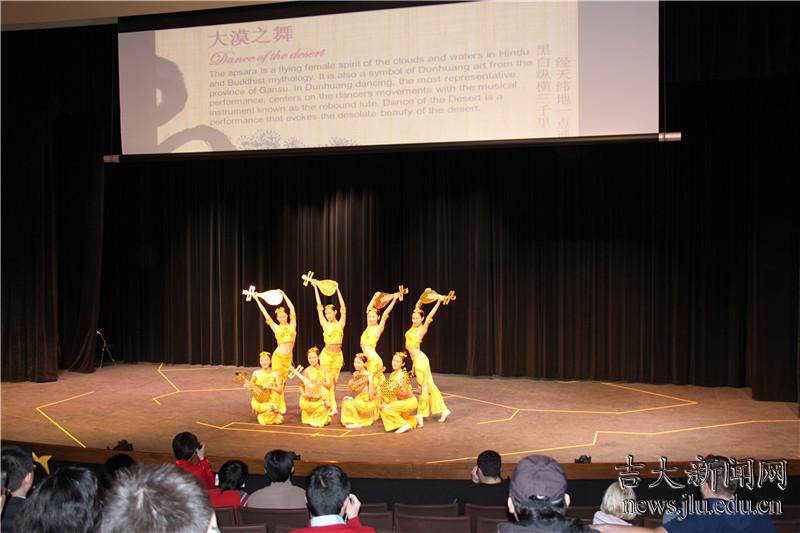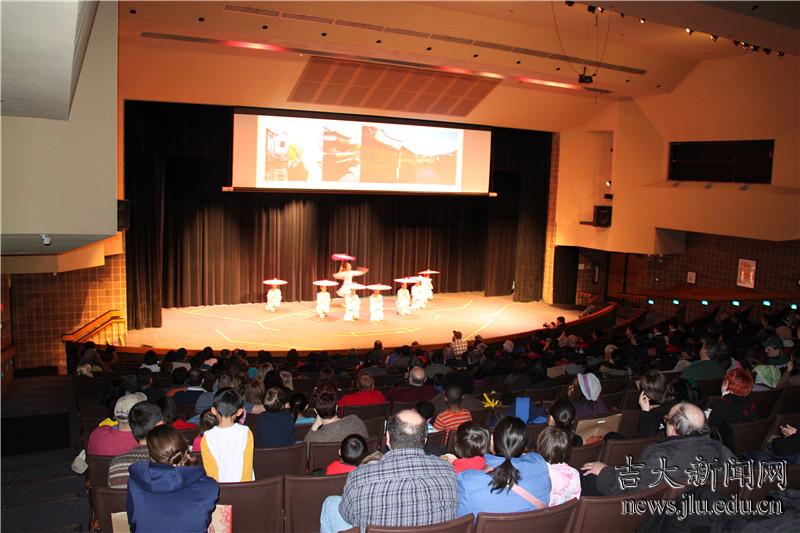 一首欢快喜庆的开场歌曲《同喜同喜》拉开了整场晚会的序幕,载歌载舞的东北秧歌立刻引来了现场观众的掌声。一曲中国传统民乐演奏《春节序曲》营造了祥和、欢腾、喜悦的节日氛围。因模仿孔雀的肢体语言而创作出来的民族舞蹈《紫竹雀翎》把整场晚会推向高潮,演员妙曼灵动的舞姿充分诠释了傣族舞的神韵。晚会期间,吉大学生还安排了现场互动环节,通过教授观众踢毽球、编织中国结及制作纸风车等形式,充分调动了现场的气氛,拉近了演员与观众的距离。本次晚会共有13个节目,内容涵盖歌曲、舞蹈、器乐等多种文艺表演形式,让在座的每一位美国朋友充分感受到了中华文化的魅力,也享受了本次晚会的欢乐与和谐,演出取得了圆满的成功。演出结束后,观众们用热烈的掌声和欢呼声表达了对代表团演出的赞美,久久不愿离去。