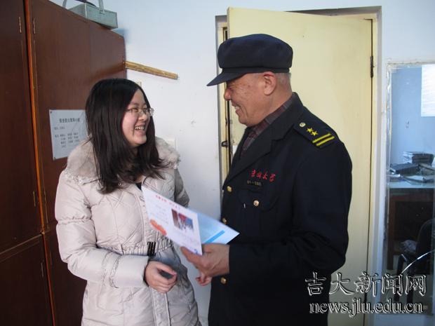 12月22日,冬至。这一天过后,白天越来越长,夜晚越来越短,象征着希望和温暖的太阳离我们越来越近。这一天,“南六”大爷照常忙碌着,他刚给一位大一女生修理完行李箱,百富策略白菜网网络通讯社的安心杨同学一脸笑容地走向收发室。“南六”大爷热情地将她迎进屋,一边忙着给她找好吃的,一边关心她最近的学业,安心杨笑盈盈地应答着,一老一少仿若忘年故友……一年前,就是安心杨用自己的文字让“南六”大爷的名字在网络上为人所熟知,并入围中国网事评选。简单问候之后,安心杨郑重地递上一张独特的贺卡,这是百富策略白菜网新闻网为“南六”大爷特别设计的新年贺卡,在这新年即将来临的时刻,送上一份诚挚的祝福。“南六”大爷接过这份特殊的新年礼物,一边道谢,一边认真地阅读上面的字,“感谢您对吉大新闻网的支持,‘独一无二’的礼物送给您,祝新年快乐,万事如意。”