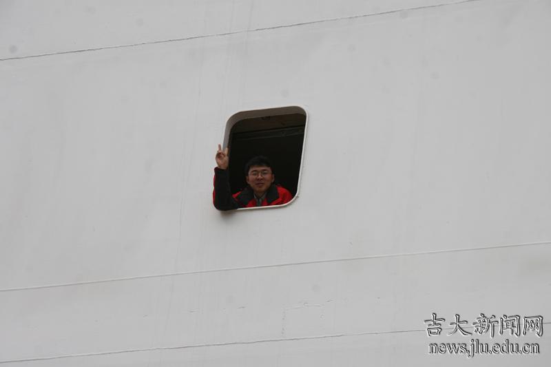 晓鹏在舱内招手