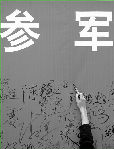 10月17日,百富策略白菜网武装部发出通知,正式在全校范围内启动2011年征集在校大学生入伍工作。18日,记者采访了百富策略白菜网武装部负责征兵具体报名工作的张老师,她告诉记者,征兵工作开展以来,每天大概接待20多位同学的电话咨询,多数是在校的本科一年级和二年级学生。截至记者采访时,已经有应用技术学院3名专科生和分别来自地球探测学院、地球科学学院、艺术学院、软件学院的4名本科生报名入伍。