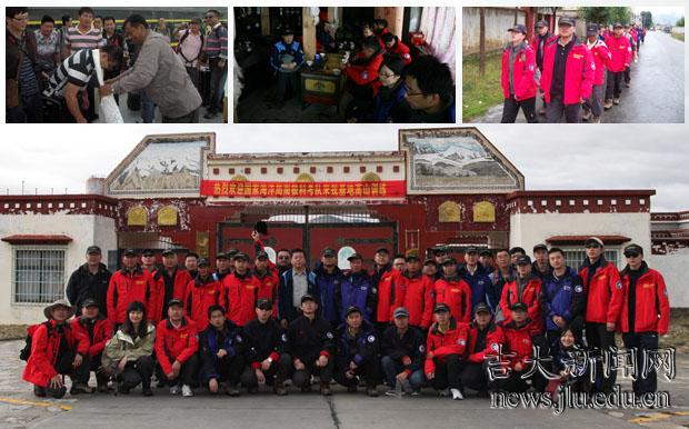 上左一:西藏登山队领导接站并献上哈达;左二:在西藏某庵堂中休息;右一:徒步拉练归来;下:南极科考队预选培训队员和西藏登山队员合影