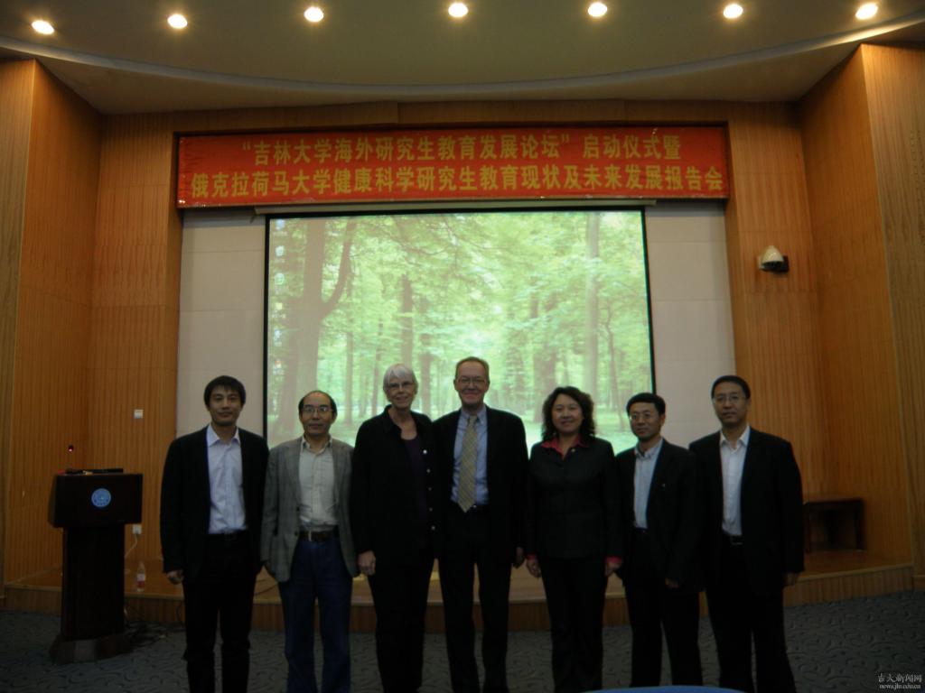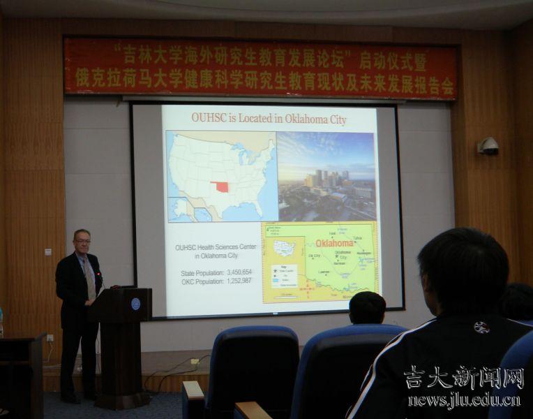 应邀而来的美国俄克拉荷马大学健康科学中心研究生院院长詹姆斯•托马赛克教授作了题为“俄克拉荷马大学健康科学研究生教育现状及未来发展”的报告。詹姆斯•托马赛克教授介绍了美国俄克拉荷马大学健康科学中心研究生教育的基本情况,说明了美国博士研究生培养的新趋势。他在报告中特别对目前在俄克拉荷马大学健康中心研究和学习的吉大学子的科研能力和个人素质给予了充分的肯定。